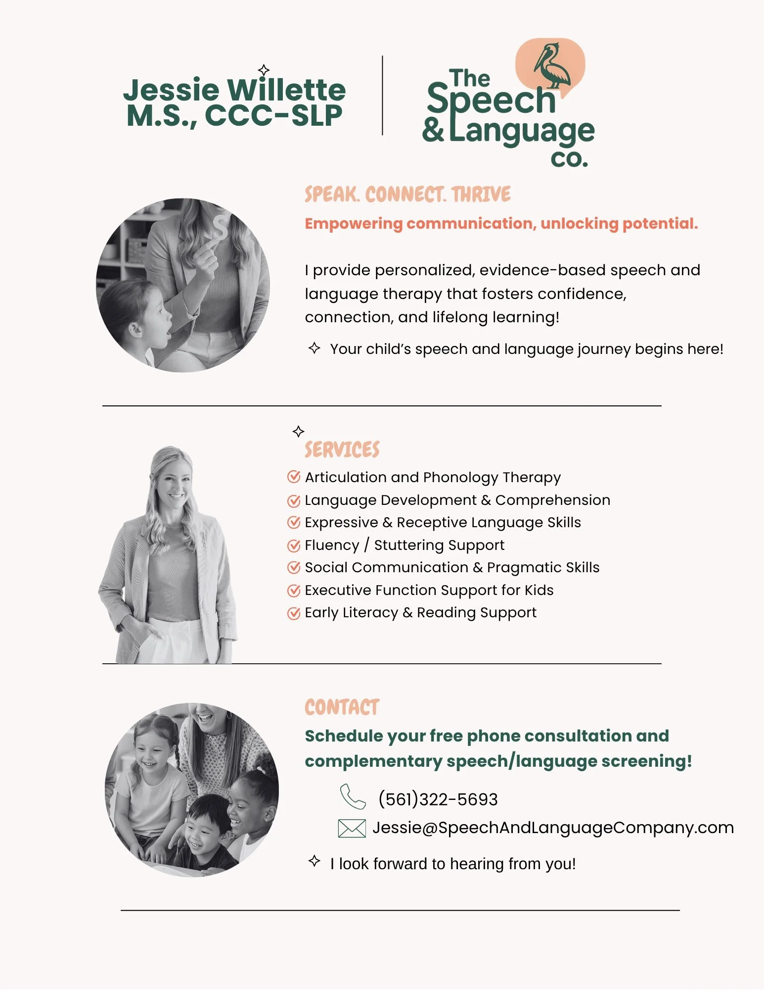 Our team is led by Jessie Willette, M.S., CCC-SLP, a licensed speech-language pathologist with a passion for helping children master speech, language, and communication skills. We combine evidence-based strategies with a fun, motivating approach, ensuring every session is both effective and enjoyable.